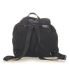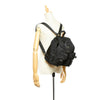 This backpack features a nylon body with leather trim, exterior front flap pockets with leather buckle closure, flat back straps, a flat top handle, a top flap with a drawstring closure, and an interior zip pocket.