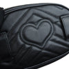 This is an authentic Gucci Marmont Belt Bag Calfskin in Black. This belt bag is crafted of calfskin leather. It features an aged gold GG logo on the front and a heart-stitched shape on the back and features an adjustable belt closure. It opens to a beige microfiber interior with a patch pocket.