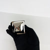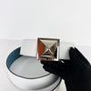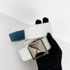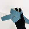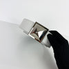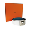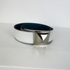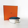 The Hermes Pyramid Reversible Belt in Blue and white features a flat leather waist strap and a palladium pyramid buckle.