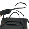 This Celine Micro Belt Bag is crafted of calfskin leather in Grey with a structured and spacious silhouette. The bag details a leather strap top handle, an optional shoulder strap with brass hardware, and a front-facing flap that is decorated by knotted straps.