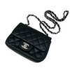 This is an authentic Chanel Lambskin Quilted Mini Rectangle in Black. The chic mini cross body is crafted of soft quilted lambskin leather featuring a silver chain link leather threaded shoulder strap and a silver classic CC turn lock. When you lift the flap, you'll discover a sleek black leather interior with a zipper and convenient patch pocket.
