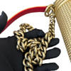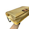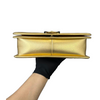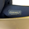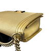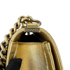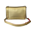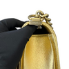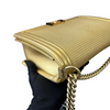 Stand out from the crowd with this Chanel Boy in New Medium in Gold color with Gold hardware. Crafted in a gold embossed textured leather. It features a chain shoulder strap with a leather shoulder pad and the iconic CC closure. This is one of a kind addition to add in your collection.