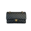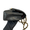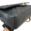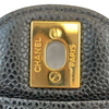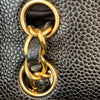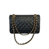 The Chanel Medium Classic flap features a quilted caviar leather body, exterior front and back slip pockets, a leather woven chain strap, a double top flap with CC turn-lock closure, and interior zip and slip pockets.