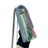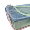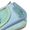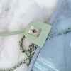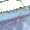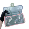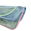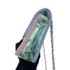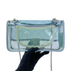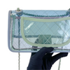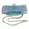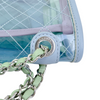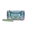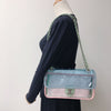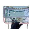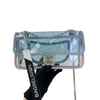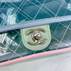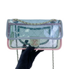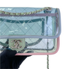 The Chanel transparent PVC Coco Splash fap handbag with blue, green, and pink lambskin leather trim and silver-tone hardware is a super rare and highly sought-after fashion piece from the 2018 Spring/Summer Collection. A signature CC turn-lock closure and pink lambskin lined rear patched pocket characterizes this limited-edition bag, with a PVC interior that has no pockets.