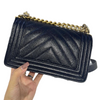 This Chanel Boy in Quilted Chevron Caviar is a rare find! Its small size and black leather and gold hardware colour combination makes it the most perfect collectable item for any Chanel addict. The interior features a fabric lining with a single interior pocket. The strap is a combination of leather and antique gold hardware, making it adjustable to your height and comfort. Our advice: don't hesitate on this one!