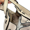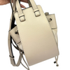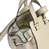This is an authentic Loewe Hammock Mini Shoulder Grained Calfskin in Sand. This bag is made of soft calfskin leather. This handbag features a unique reinforced design with cinch cords, leather top handles, and a adjustable shoulder strap. The top opens to a spacious beige fabric interior with patch pockets.
