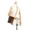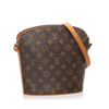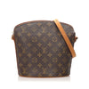 The Louis Vuitton Drouot features a monogram canvas body, an adjustable leather strap, a top zip closure, and an interior slip pocket.