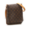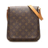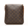 The Louis Vuitton Musette Salsa features a monogram canvas body, an adjustable shoulder strap with buckle details, a front flap with a magnetic closure, and an interior slip pocket.