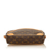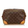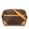 The Louis Vuitton Trocadero 27 features a monogram canvas body with a leather trim, a flat shoulder strap, a top zip closure, an exterior slip pocket, and an interior zip pocket.