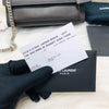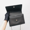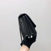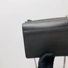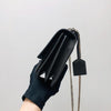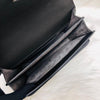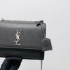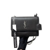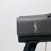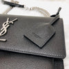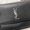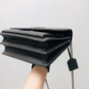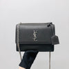 This chic Saint Laurent Flap Front Sunset Monogram Bag is made of 100% calfskin leather and has a padded top handle with rings. It features a dark grey chain strap and leather shoulder pad that can be worn crossbody or doubled on the shoulder, making it a stylish versatile fashion accessory. The bag also has a leather-encased key ring and metal interlocking YSL signature on the front flap with black metal hardware.