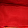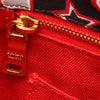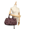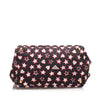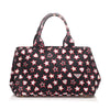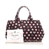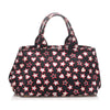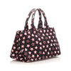 This handbag features a printed canvas body, rolled handles, an open top, and interior zip and slip pockets.