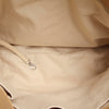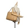 This tote bag features a leather body, exterior front zip pockets, leather woven chain straps, a top strap with magnetic snap button closure, and interior zip pockets.