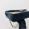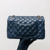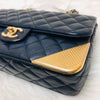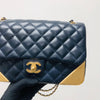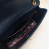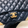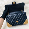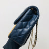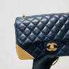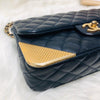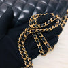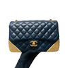Turn heads with this unique and rare style. This Chanel flap bag is crafted from luxurious diamond quilted calfskin leather in black with textured gold metal corners, a flap top secured with a CC turn-lock in gold hardware, and a long matte gold chain link leather interlaced shoulder strap.