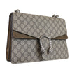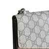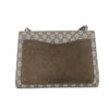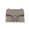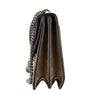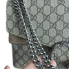 This Dionysus features a coated canvas body, ruthenium-tone chain straps, a top flap with push lock closure, and an interior zip compartment.