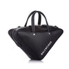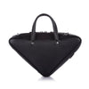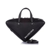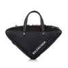The Triangle Duffle features a leather body, flat leather handles, a detachable flat leather strap, a top zip closure, and an interior zip pocket.