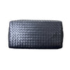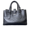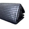 This is an authentic Bottega Veneta Roma Tote Small Light Calf Intrecciato in Black. This elegant handbag is crafted from black woven leather and features matching top handles, an optional shoulder strap. The bag has a partitioned open top with a taupe lining and zipper and flat pockets.