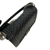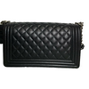 This Chanel Boy old medium bag in black caviar leather features beautiful ruthenium hardware. It can be worn either as a shoulder or crossbody bag. You do not want to miss the chance to own this!