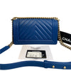 This Boy bag is features a beautiful chevron quilt lambskin body and gold hardware, its an absolute must for any luxury lover.  Its soft light blue color makes this a fun statement bag for everyday wear.  Our advice? Get this piece before it's too late!