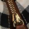 This Burberry shoulder bag features a canvas body with leather trim, a flat leather handle, a top zip closure, and interior zip and slip pockets.