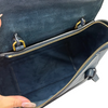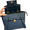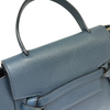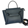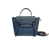 This is an authentic Celine Nano Belt Bag Grained Calfskin in Blue. This chic tote is made of richly grained calfskin leather. The bag features a leather top handle and a adjustable shoulder strap with polished gold hardware. The facing flap opens to reveal a top zipper and a suede leather interior.