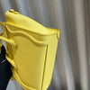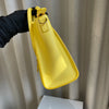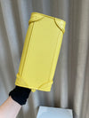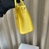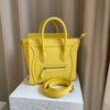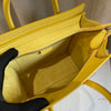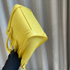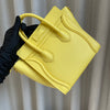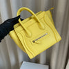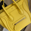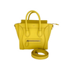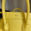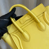 This Celine Nano Luggage Tote in Citron is a stylish bag and one of the most popular designer handbag styles. It features rolled leather handles, a gold-tone front zipper. The interior is made of suede and has a zipper and patch pockets. The bag has a zipped closure and protective studs on the base.