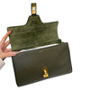 This is an authentic Celine Teen 16 Crossbody Smooth Calfskin in Army Green. This bag is made of smooth green calfskin leather. The bag features a canvas shoulder strap and a polished gold twist lock closure. The handbag opens a partitioned suede interior with a zipper pocket.