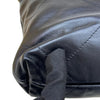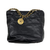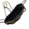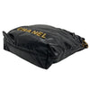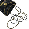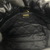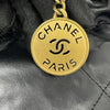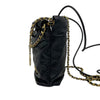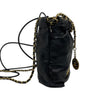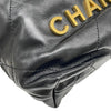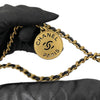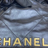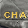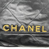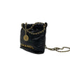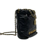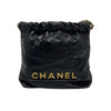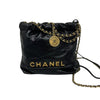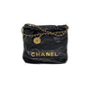 This is an authentic Chanel 22 Mini Shiny Calfskin Quilted in Black. This stylish bag is made from smooth black calfskin leather with diamond stitching. It features a leather-threaded aged gold chain shoulder strap, an aged gold medallion, and a gold Chanel logo. The bag opens to reveal a black quilted fabric interior with a flat pocket.