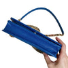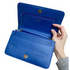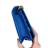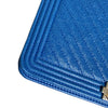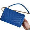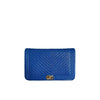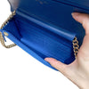 This Boy wallet on a chain features a chevron quilted caviar leather body, a leather woven chain strap, a front flap with magnetic snap closure, and interior zip and slip compartments.