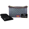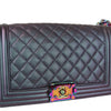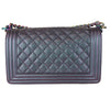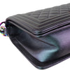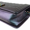 This is an authentic Chanel Boy Flap Medium Iridescent Goatskin Quilted in Purple. This popular flap bag is crafted of iridescent goatskin leather with a purple sheen. It has an iridescent shoulder chain with a shoulder pad, a diamond-quilted flap with a linear-quilted border, and an iridescent CC boy push lock. The flap reveals a black fabric interior with a patch pocket.