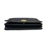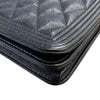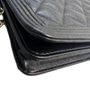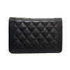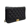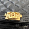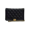 This is an authentic Chanel Boy Wallet on Chain WOC Caviar in Black. This beautiful wallet is made from luxurious diamond-quilted caviar leather in black, adorned with peripheral linear quilting. It boasts an aged gold chain-link shoulder strap and a faux aged gold Chanel Boy CC press lock. The front flap opens to reveal a compact interior in black leather and fabric, equipped with card slots, a patch pocket, and a zipper compartment.