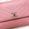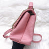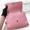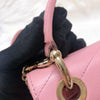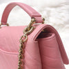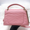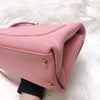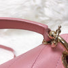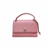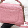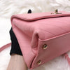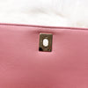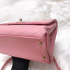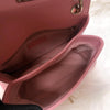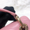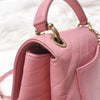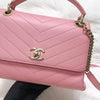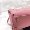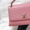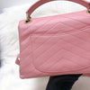 This Chanel Calfskin Chevron Chic Top Handle Bag is a unique and elegant piece! It features a chevron stitched grained calfskin leather exterior quilted in pink, silver hardware, and a rear patch pocket. It has a sturdy leather top handle, an optional adjustable silver chain-link shoulder strap with a leather shoulder pad, and the signature Chanel CC turn clock closure in silver hardware.