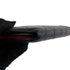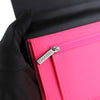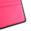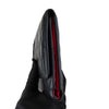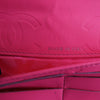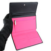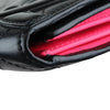 This is an authentic Chanel Cambon Gusset Flap Wallet Calfskin Quilted in Black. It’s a black calfskin leather wallet with a stitched patent leather black Chanel CC logo on the front flap. The interior is bright pink fabric and leather, embossed with CC logos, and includes card slots, patch pockets, and a zipper compartment.