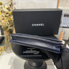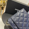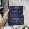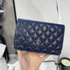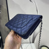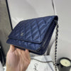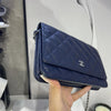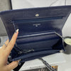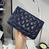 This Caviar Wallet on Chain features a navy caviar leather body, a leather woven silver-tone chain strap, a front flap with magnetic snap closure, and interior zip and slip pockets.