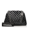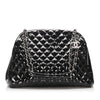 The Just Mademoiselle features a quilted patent leather body, curb chain straps, a top magnetic snap button closure, an interior zip compartment, and interior zip and slip pockets.
