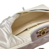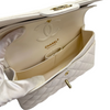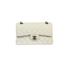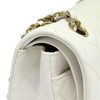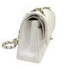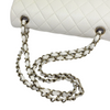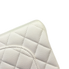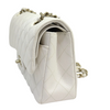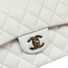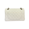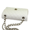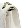 This is an authentic Chanel Classic Double Flap Small Caviar Quilted in White. This stunning shoulder bag is crafted of caviar leather featuring a gold chain-link leather-threaded shoulder strap, a rear patch pocket, and a facing Chanel CC turn lock. This opens to reveal an inner flap and a leather interior with patch pockets.