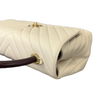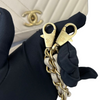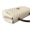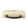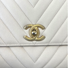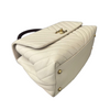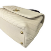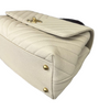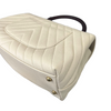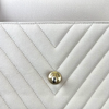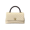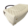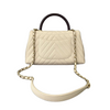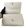 This Chanel Coco Medium Chevron Handle Flap Bag in white caviar leather is a unique and elegant piece. It features a caviar leather exterior and a lizard embossed leather top handle. This beauty can be worn as a top handle, a crossbody, or a shoulder bag.