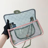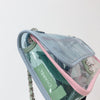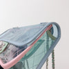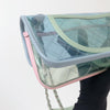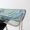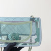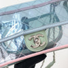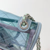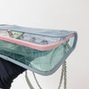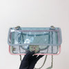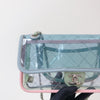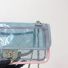 The Chanel transparent PVC flap handbag with blue, green, and pink lambskin leather trim and silver-tone hardware is a super rare and highly sought-after fashion piece from the 2018 Spring/Summer Collection. A signature CC turn-lock closure and pink lambskin lined rear patched pocket characterizes this limited-edition bag, with a PVC interior that has no pockets.