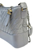 This is an authentic Chanel Gabrielle Hobo Large Aged Calfskin Chevron in Grey. This chic shoulder bag is made of chevron-quilted, aged calfskin leather with a smooth grey calfskin base. The bag features a leather threaded chain link shoulder strap in multiple hardware tones including polished gold, silver, and aged ruthenium. The interlocking CC logo zipper pull opens the bag to a compact fabric interior with zipper and patch pockets.