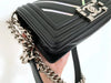 This Chanel Iridescent PVC Small Boy Flap is made of chevron-quilted lambskin leather with a structured linear trim with silver iridescent accents to the chevron design. It has a polished silver chain-link shoulder strap with a leather shoulder pad that provides versatility and effortless elegant ease.