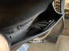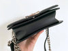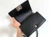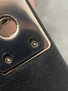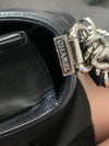 The overall condition of the bag is 9/10. The lambskin leather exterior is clean and has some imprinted marks. The sides of the bag have softened with time. Tiny hairline scratches can be found on front clasp hardware. Side and back of flap hardware still have protective stiles on it. The interior's black fabric is clean.
