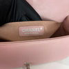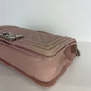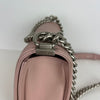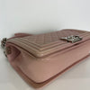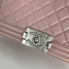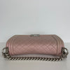 This Chanel Le Boy bag in pink lambskin quilted leather features beautiful matte silver hardware. The iconic Chanel Boy Bag can be worn either as a shoulder or crossbody bag.