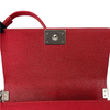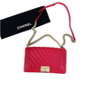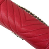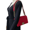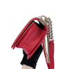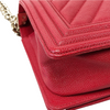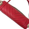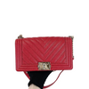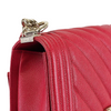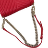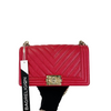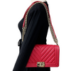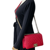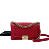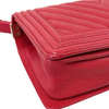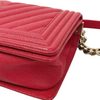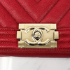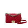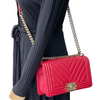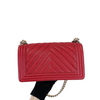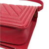 This Chanel Medium Boy Chevron Bag is constructed in durable red caviar leather, with gold-tone hardware. It features a full front flap with the CC push-lock closure, a gold-tone chain link, and red caviar leather padded shoulder/crossbody strap. The interior offers the space to carry all your essentials and is lined in red fabric, with an open pocket on the rear wall.