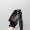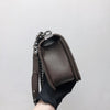 This Chanel Old Medium Boy bag is in brown quilted caviar leather, with silver-tone hardware. It features a full front flap with the Le Boy CC push lock closure and an antique silver-tone chain link and red leather padded shoulder/crossbody strap. The interior offer the space to carry all your essentials and is lined in brown fabric, with an open pocket on rear wall.