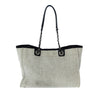 Chanel Small Deauville Tote Bag Gray. The Small Deauville tote bag features a canvas body, curb chain straps, an open top with a magnetic snap button closure, and interior zip and slip pockets.
