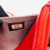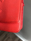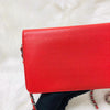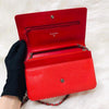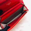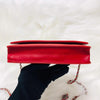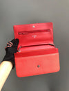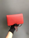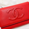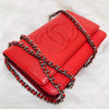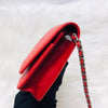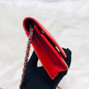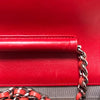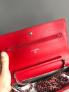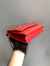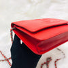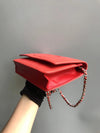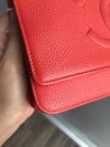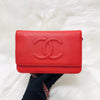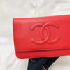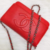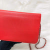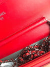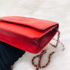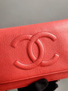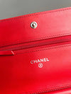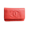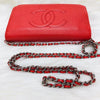This fashionable wallet on chain is made from luxurious caviar leather in red and features a silver-toned leather-threaded chain-link shoulder strap, an embossed Chanel CC logo on the flap, and a snap closure.