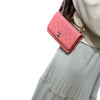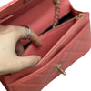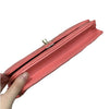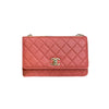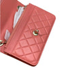 This Chanel Trendy CC Wallet on Chain Wallet on Chain features an orange lambskin quilted leather body, a leather woven gold-tone chain strap, a front flap with a snap closure, and interior zip and slip pockets.