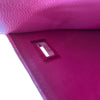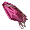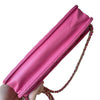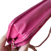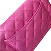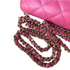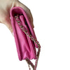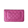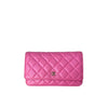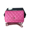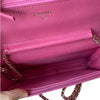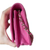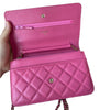 This Caviar Wallet on Chain features a pink caviar quilted leather body, a leather woven gold-toned chain strap, a front flap with a snap closure, and interior zip and slip pockets.