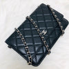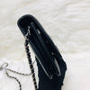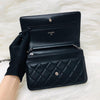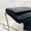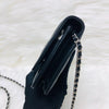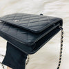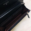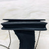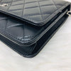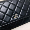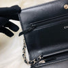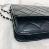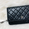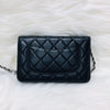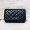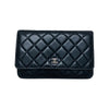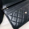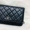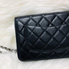 The Chanel Quilted Wallet on Chain is the perfect complement to your outfit. It is crafted of luxuriously soft diamond quilted lambskin leather in black and features a full silver metal hardware plate with the Chanel logo, a leather-threaded silver chain-link shoulder strap, and a facing flap with a silver Chanel CC detailing.