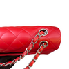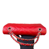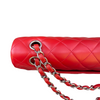 This Medium Sized Chanel classic flap bag is made from diamond quilted lambskin leather in red and features a silver chain-link leather-threaded shoulder straps and a front flap with a silver CC turn lock.