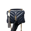 Contrasting chevron-quilted panels of navy leather and suede, this Saint Laurent's College bag exults sophistication and elegance. It offers a gold-tone metal chain and leather shoulder strap, and is detailed with the iconic monogram plaque set into the top flap. Its interior offers space for all your essentials and a zip pocket.